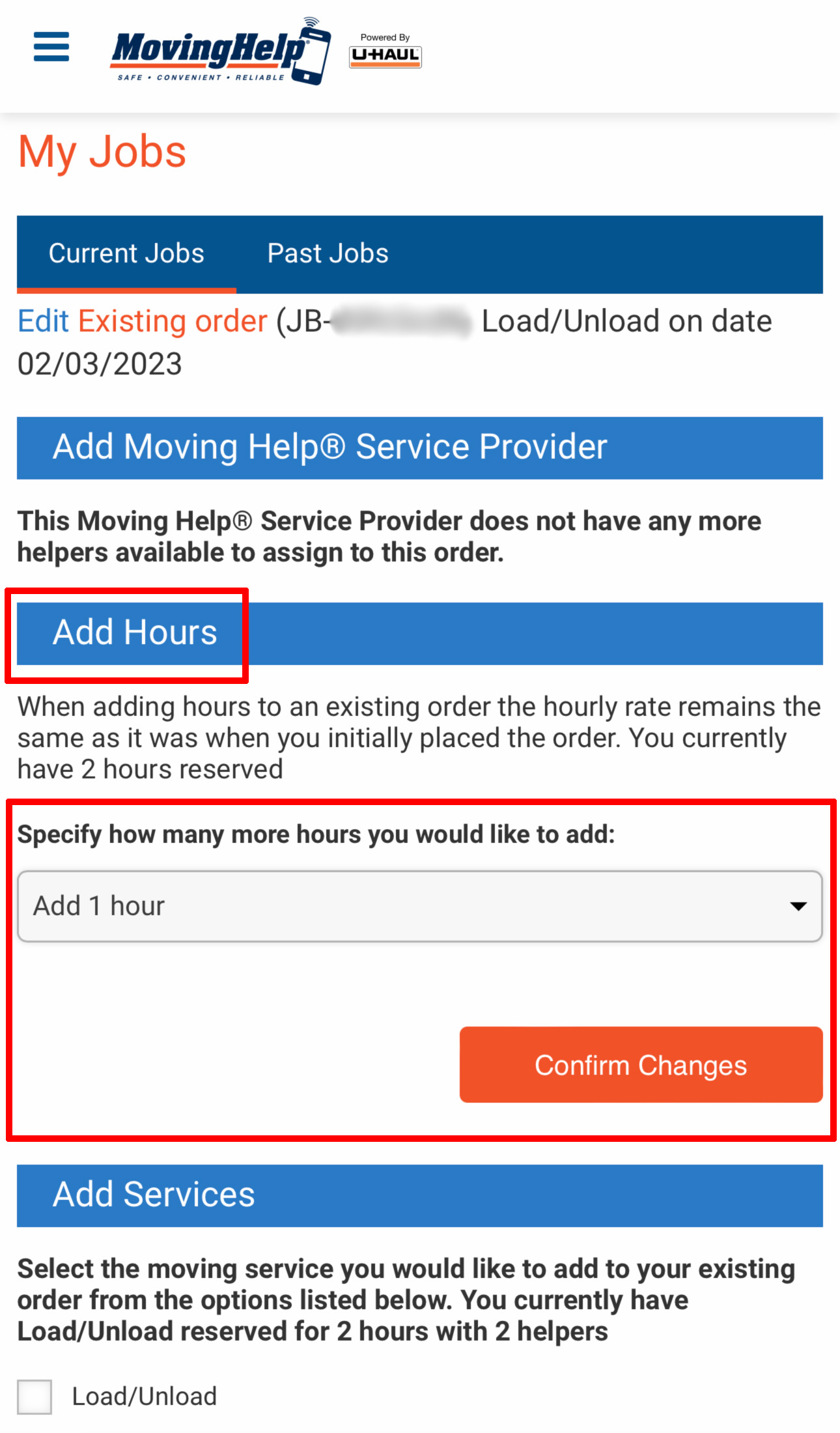 Scroll down until you see the “Add Hours” section. Then select the additional number of hours you need for your move. Then click on the “Confirm Changes” button. Next, a billing screen will pop up. Enter your information and click on the “Pay Now” button. This will confirm how many hours you’re adding and the total cost for adding that certain number of hours.