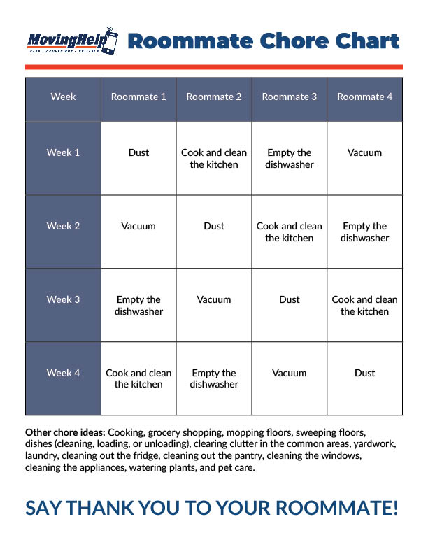 You and your roommate will want to discuss a chore calendar. This is why Moving Help created a Roommate Chore Chart, which you can adjust depending on how many roommates live with you.